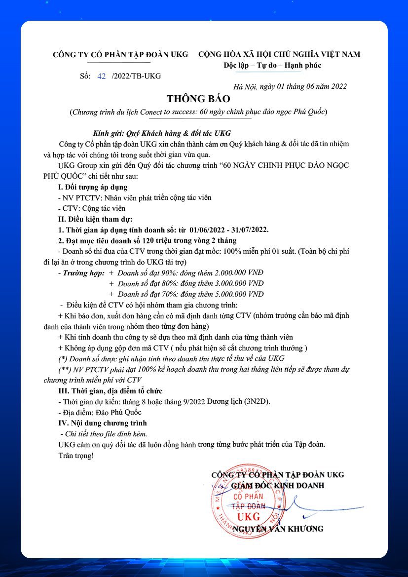 Cộng tác viên có thành tích xuất sắc sẽ hội tụ cùng UKG tại Đảo Ngọc – Phú Quốc sau 60 ngày CHINH PHỤC THỬ THÁCH từ 1.6.2022 đến hết 31.7.2022. Cụ thể: